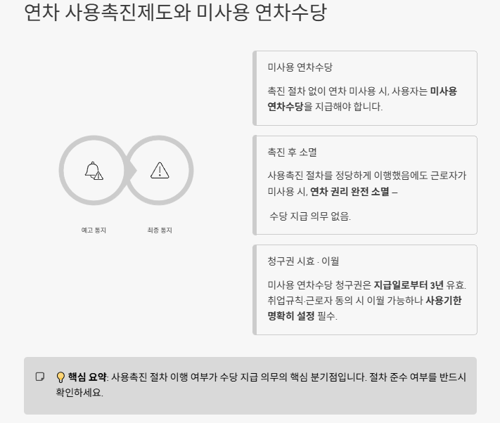 - 촉진 절차를 정당하게 이행했음에도 미사용한 경우: 연차 권리가 완전 소멸될 수 있으며, 수당 지급 의무가 없을 수 있습니다.